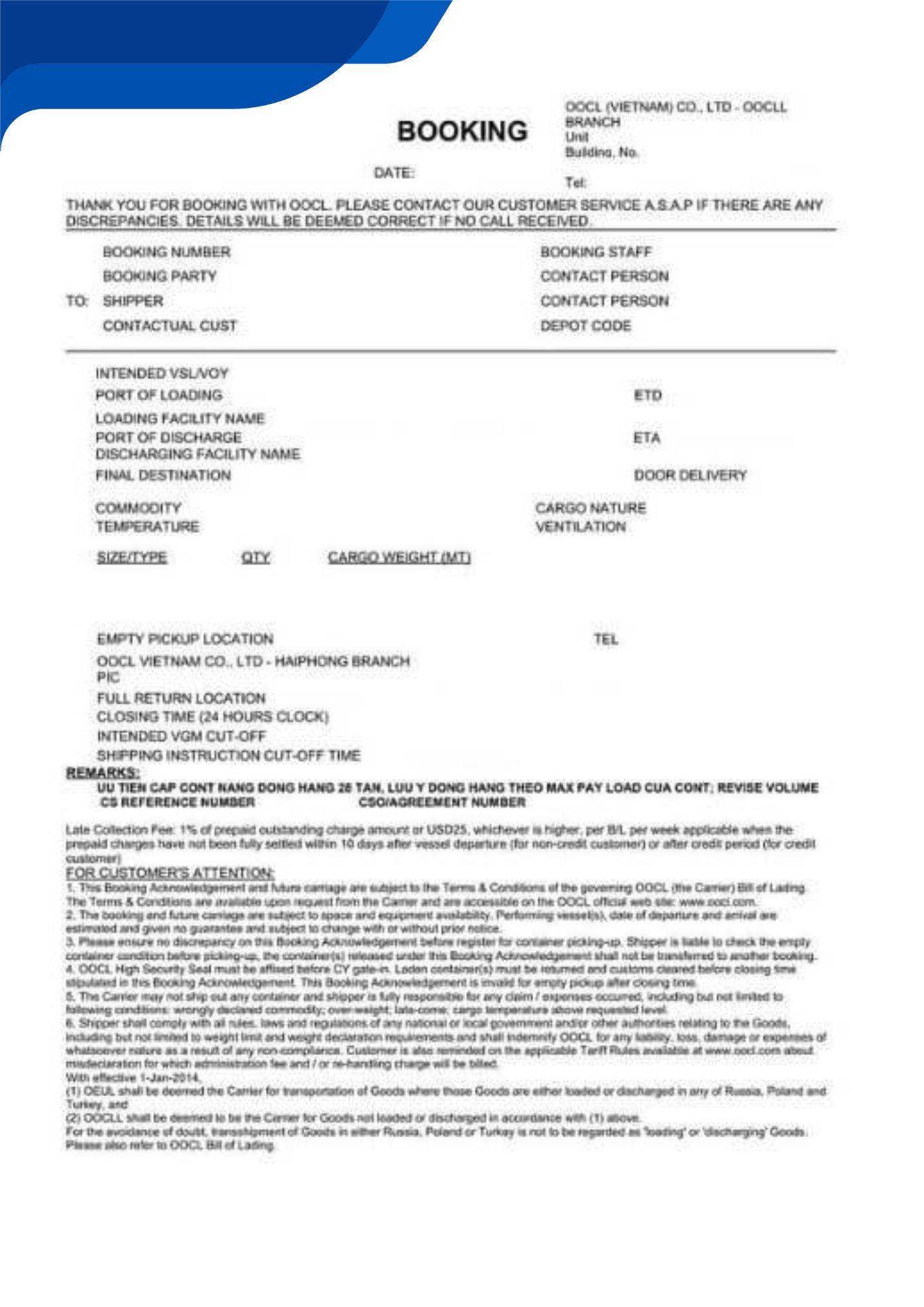 Điều khoản thanh toán trên Booking Note quy định rõ ràng về chi phí vận chuyển, phương thức thanh toán, và các điều khoản tài chính khác giữa người gửi và đơn vị vận chuyển. Đây là một phần không thể thiếu để đảm bảo rằng mọi giao dịch tài chính đều minh bạch và không có bất kỳ sự hiểu lầm nào giữa các bên.