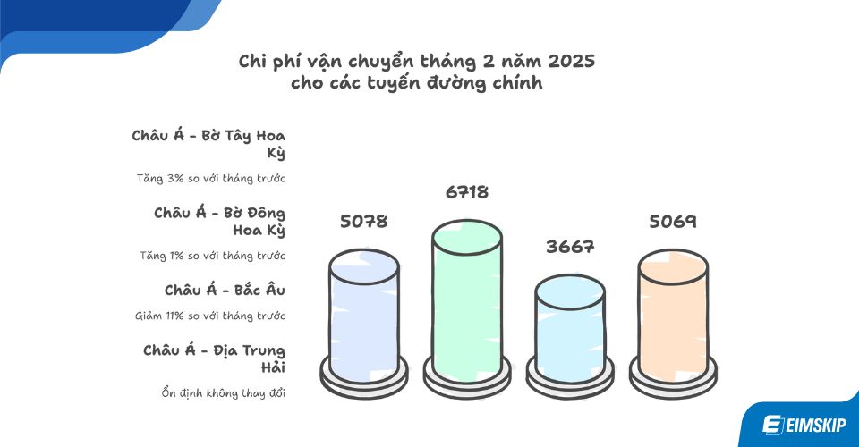 Thị trường vận tải biển tháng 2/2025 ghi nhận giá cước biến động mạnh do thuế quan, căng thẳng Biển Đỏ và thiếu hụt container. Xem ngay xu hướng, dự báo và giải pháp tối ưu chi phí vận chuyển!