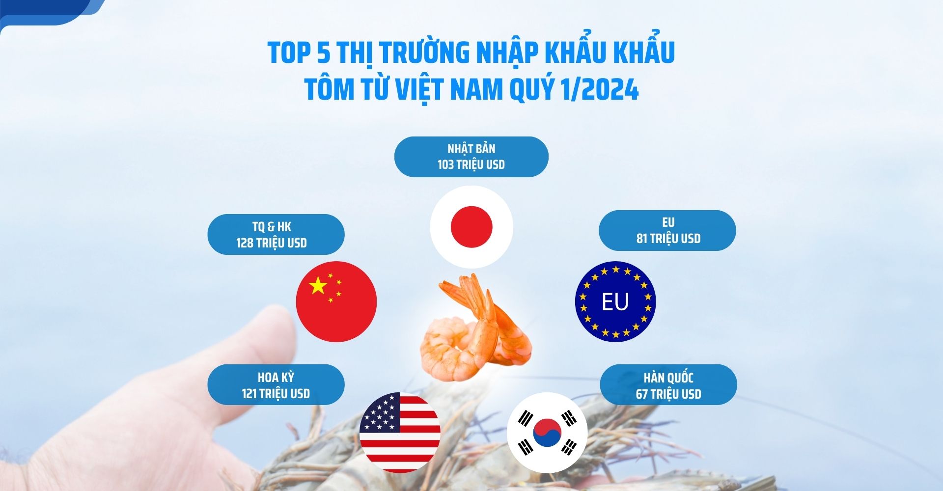 Theo thông tin từ VASEP, trong quý đầu năm 2024, giá trị xuất khẩu tôm của Việt Nam đã vượt mốc 686 triệu USD, tăng 14% so với quý đầu năm 2023. Trong tháng 3/2024, giá trị xuất khẩu tôm đạt mức 272 triệu USD, tăng nhẹ 3% so với tháng 3/2023. Mặc dù mức tăng trưởng không đáng kể nhưng điều này cho thấy thị trường đang dần hồi phục. Trong tháng 3/2024, Trung Quốc&HK và Mỹ là hai thị trường tiêu biểu, với mức tăng trưởng lần lượt là 17% và 4% so với tháng 3/2023. Tính chung trong 3 tháng đầu năm 2024, xuất khẩu tôm sang Trung Quốc&HK đạt 128 triệu USD, tăng 75%; xuất khẩu sang Mỹ đạt 121 triệu USD, tăng 16%. Tuy nhiên, xuất khẩu sang Nhật Bản, Hàn Quốc và EU trong quý đầu năm 2024 vẫn ghi nhận mức giảm từ 2%-14% so với cùng kỳ năm trước. Điểm nhấn trong quý đầu năm 2024 là hoạt động xuất khẩu tôm của Việt Nam sang một số thị trường nhỏ hơn như Canada, Đan Mạch, Anh, Đài Loan, Nga đã tăng trưởng từ 17% - 224% so với cùng kỳ năm 2023.